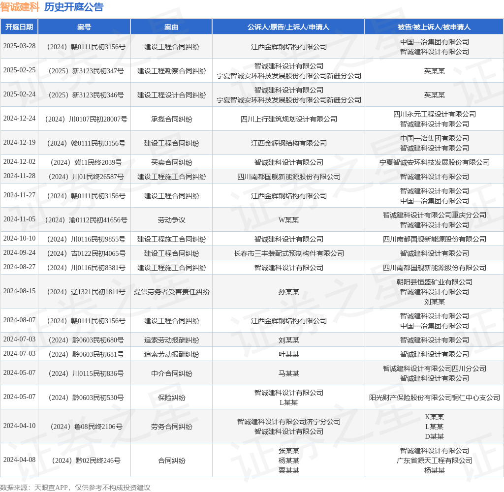 案号:(2025)新3123民初347号审理法院:沙县人民法院案由:建设工程勘察合同纠纷当事人信息: 原告/上诉人:智诚建科设计有限公司、宁夏智诚安环科技发展股份有限公司新疆分公司 被告/被上诉人:英某某开庭日期:2025年2月25日根据统计,近一年内以智诚建科设计有限公司为当事人的历史开庭公告有22则,其中案由为“建设工程合同纠纷”的公告以5则居首,其次为“建设工程施工合同纠纷”有3则,“劳务合同纠纷”有2则。历史开庭公告(前20条)如下: